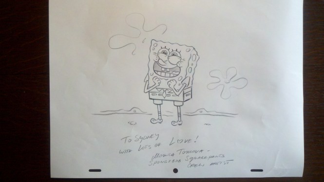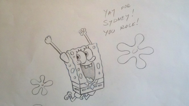 When Sydney told us her favorite character was SpongeBob SquarePants, our great friend and Futurama artist, Joseph Scott, got right on the case, connecting us with the very talented SpongeBob artist, Monica Tomova. Monica made two drawings for Sydney and wrote her a letter too. Sydney says the drawings “made my day” and that she “can’t wait to hang them up!” Thank you Joseph and Monica for giving this program such an incredible start and and thank you to Sydney whose bravery and positive attitude is an inspiration.
