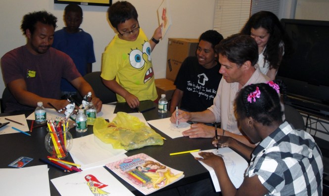 The kids did an amazing job of creating their own flip flop books tonight! They drew creatures onto three different pages, then made those pages into a book and cut the pages into three sections so that when they turned one flap the creature became an entirely new beast! Some of their creations were: dogs with serpent tails, hydra dragons, Teddy bear cats and even a part ox/part insurance salesman! Thank you to Elana Amity, John Jay Cabuay, Joan Chiverton, Joe Jurewicz, Oded Naaman and Elizabeth Winter for volunteering.