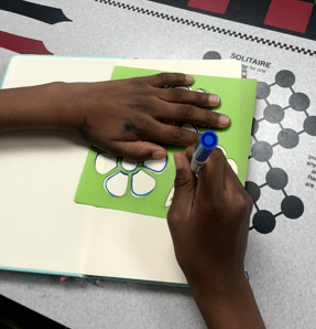 Part one of glue drawing fun! Dennis Calero led our wonderful group of kids from Red Door Community in making flowers, and trees, and Despicable Me’s.
