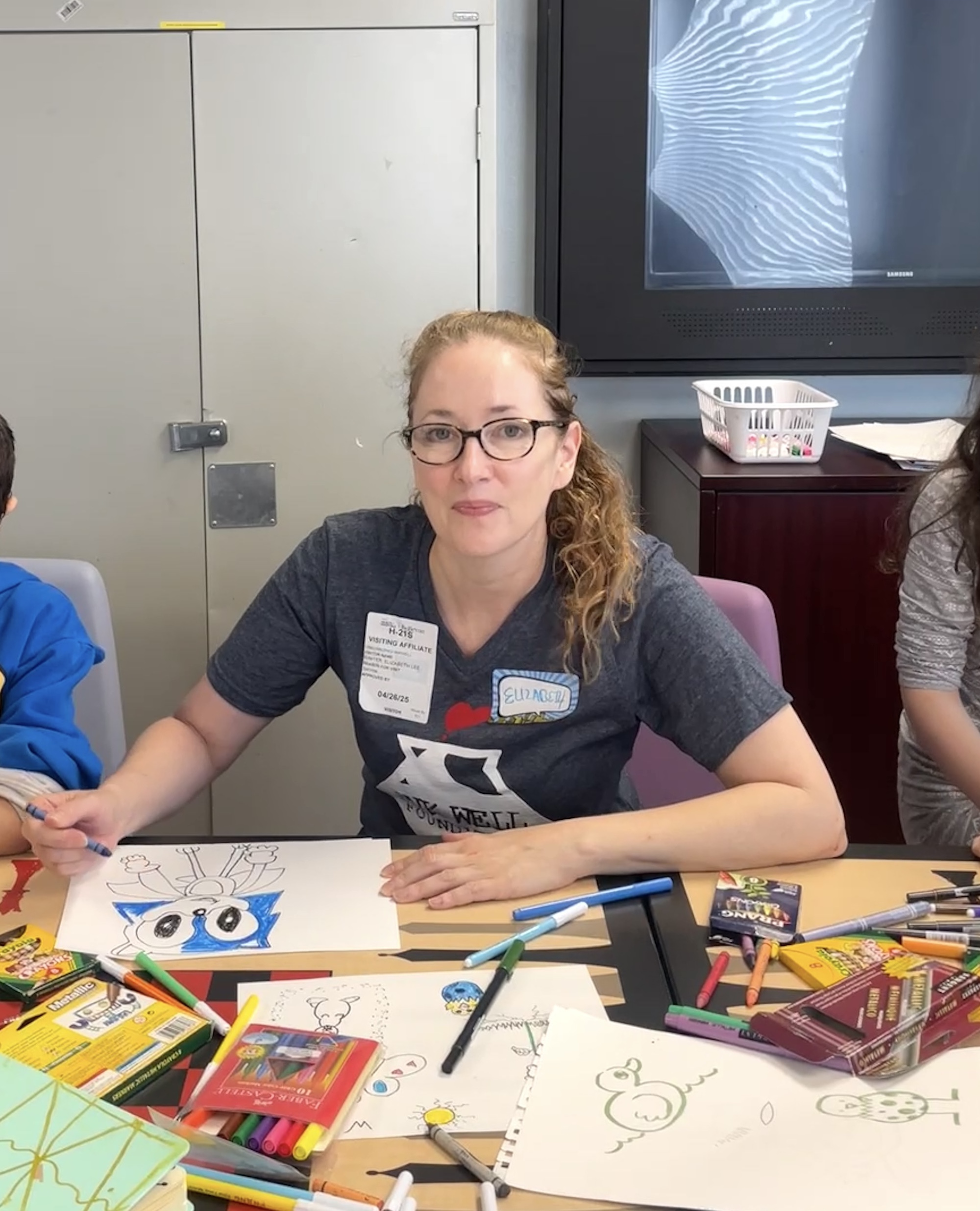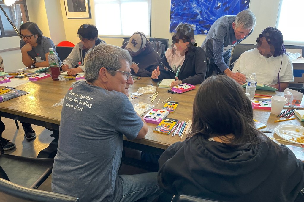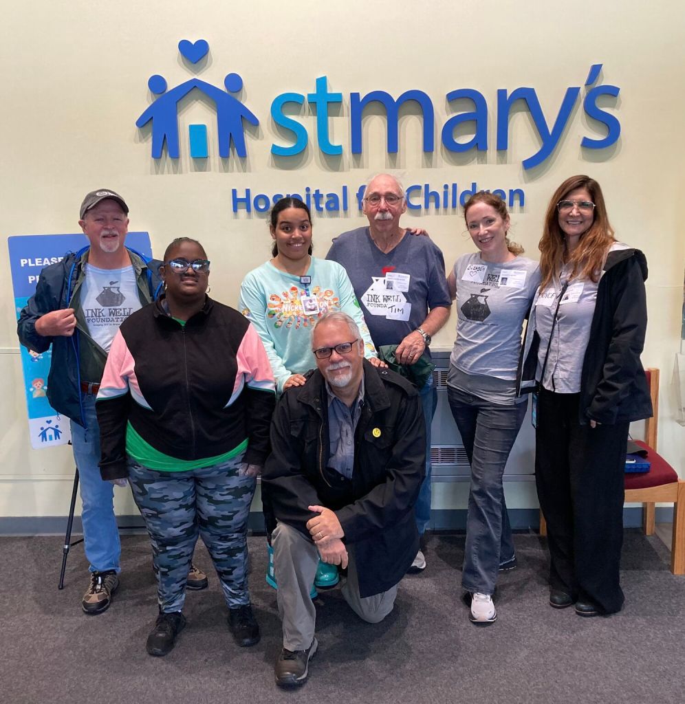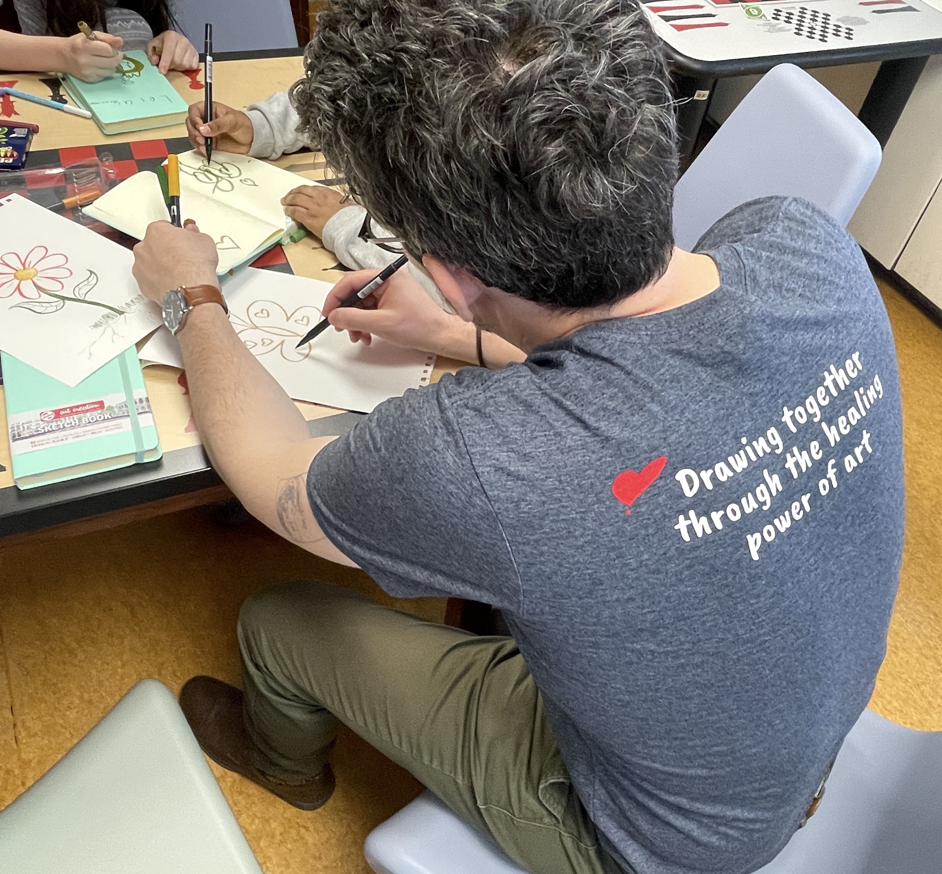 Huge thanks to our incredible Event Director for everything we do at St. Mary’s Hospital, Tim Savage. And to our trusty volunteers–Ray Alma, Jane Archer, Marty Macaluso, and Adrian Sinnott–who drew steadily for nearly two hours, creating countless drawings with the kids and imparting so many new skills that will help them continue to create on their own.