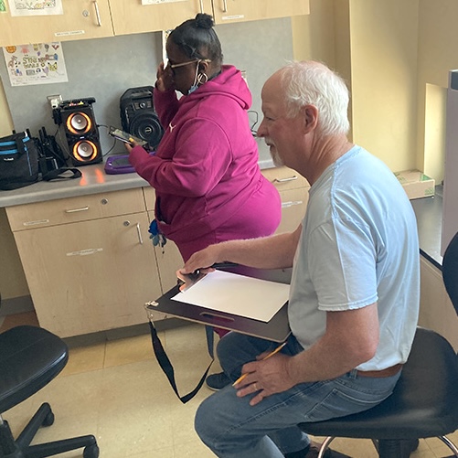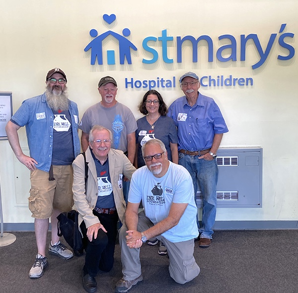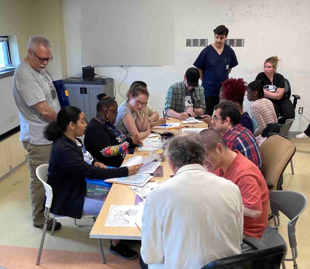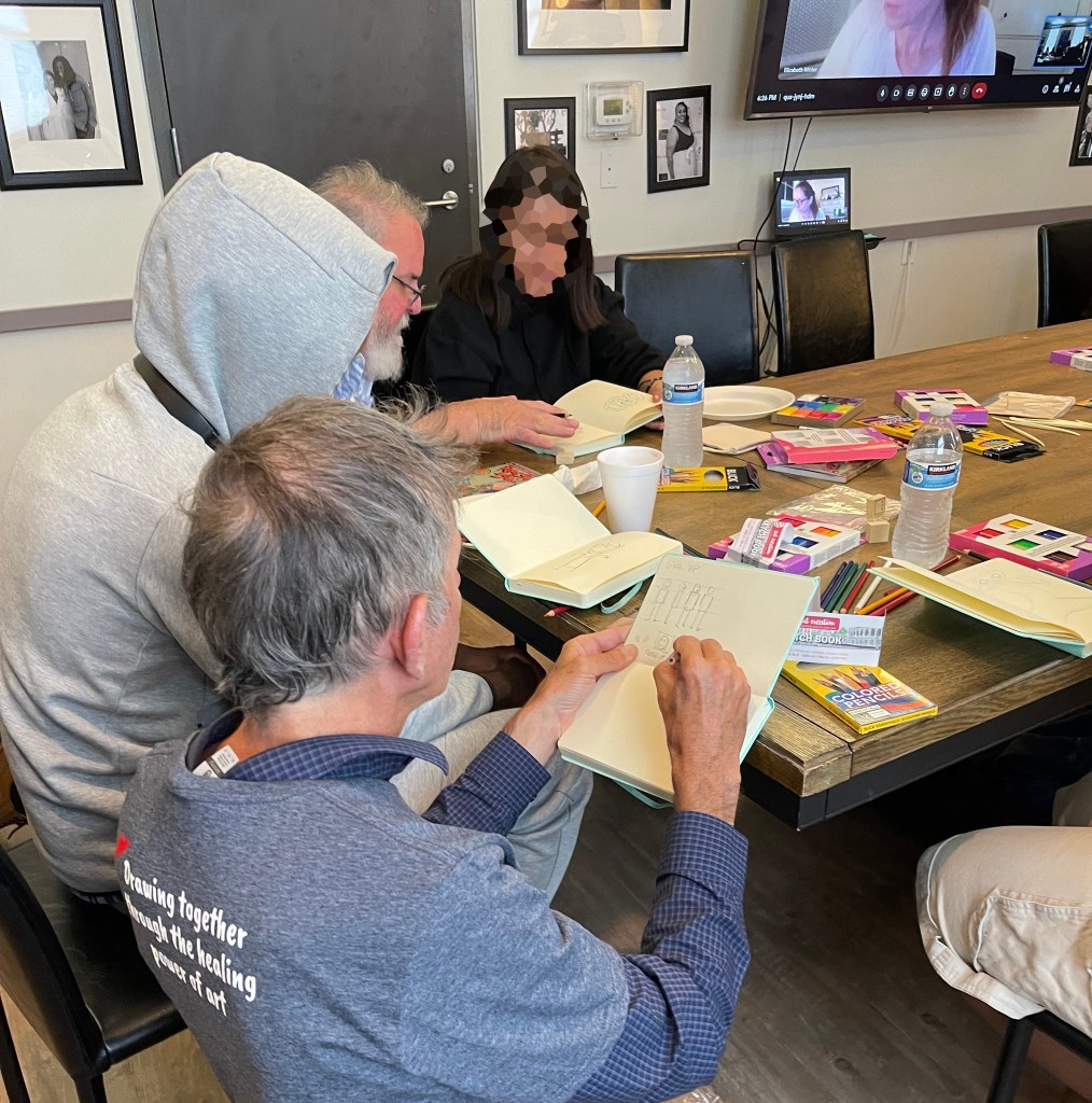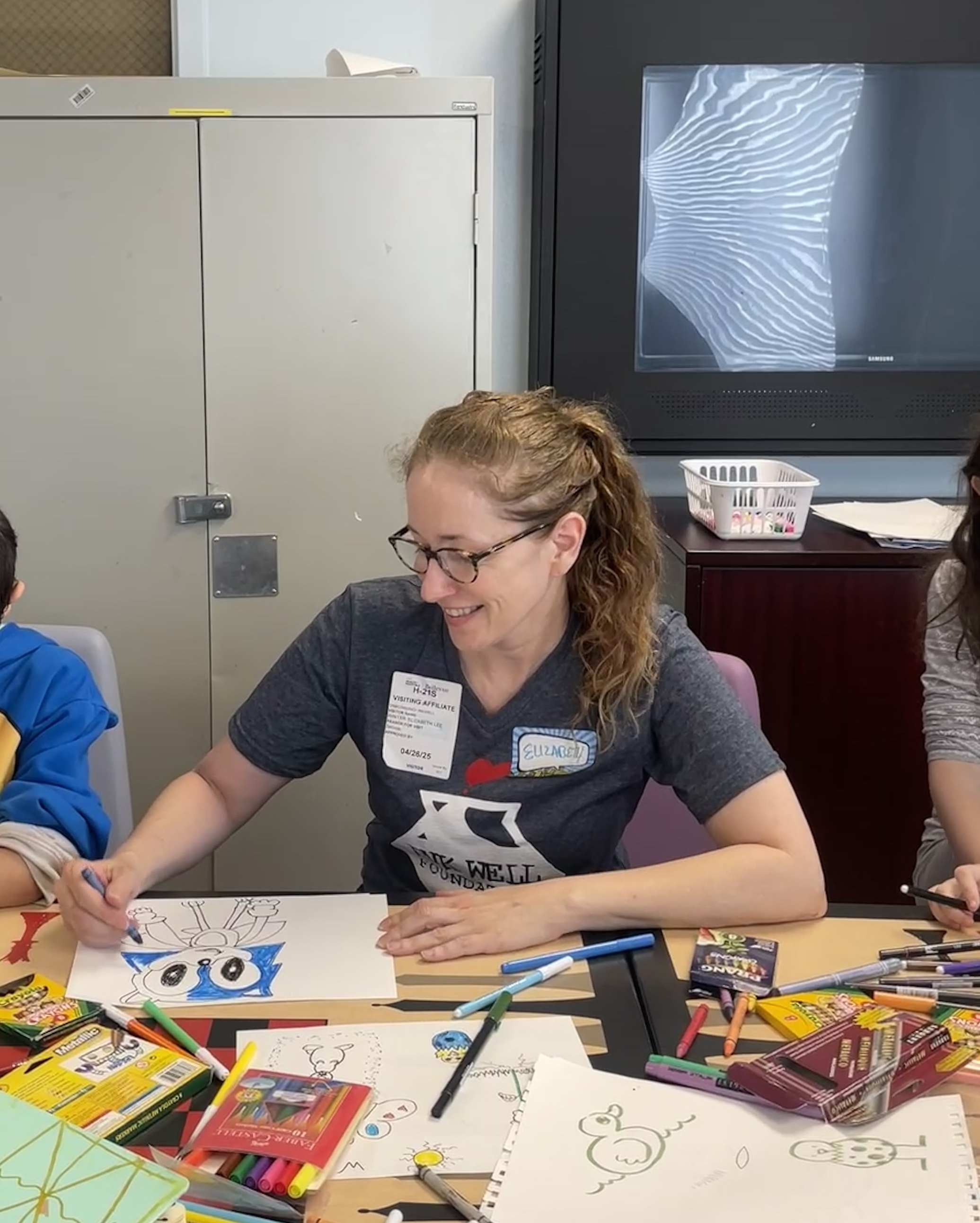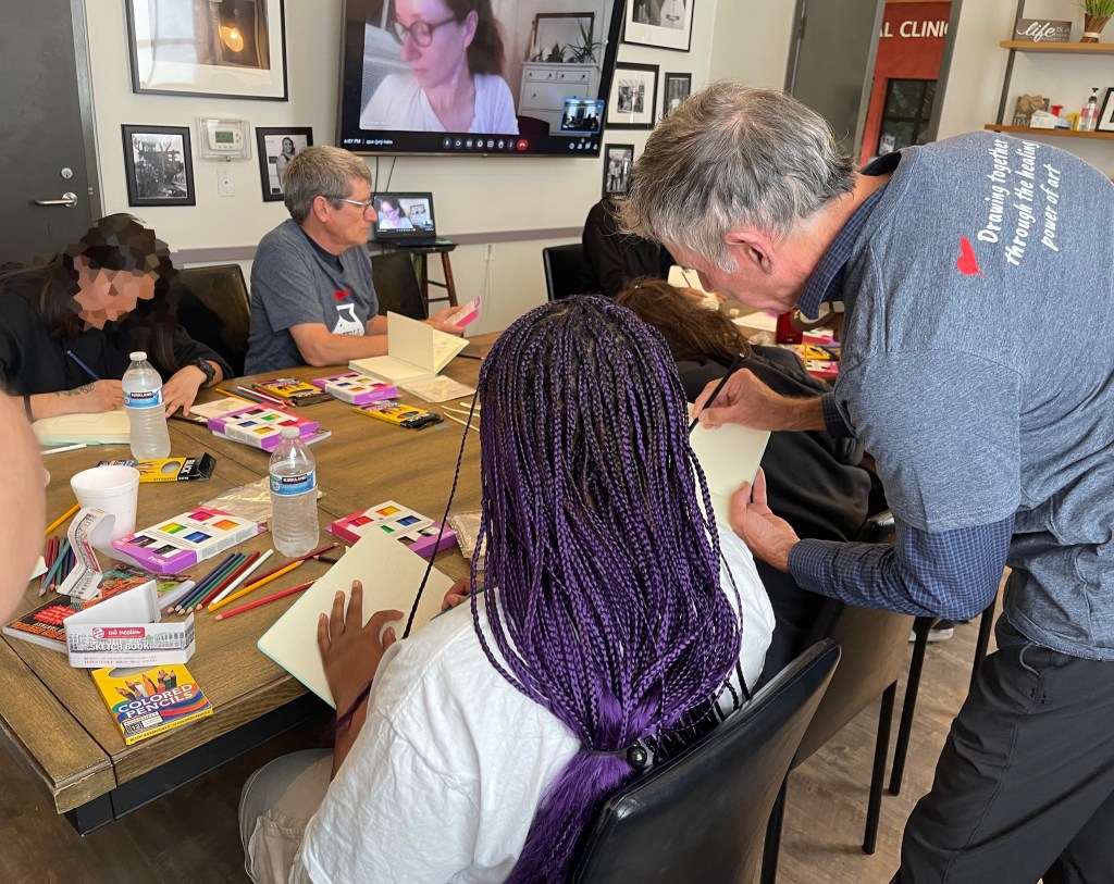 Huge thanks to our incredible Event Director for everything we do at St. Mary’s Hospital, Tim Savage. And to our trusty volunteers–Ray Alma, Jane Archer, Marty Macaluso, and Adrian Sinnott–who drew steadily for nearly two hours, creating countless drawings with the kids and imparting so many new skills that will help them continue to create on their own.
