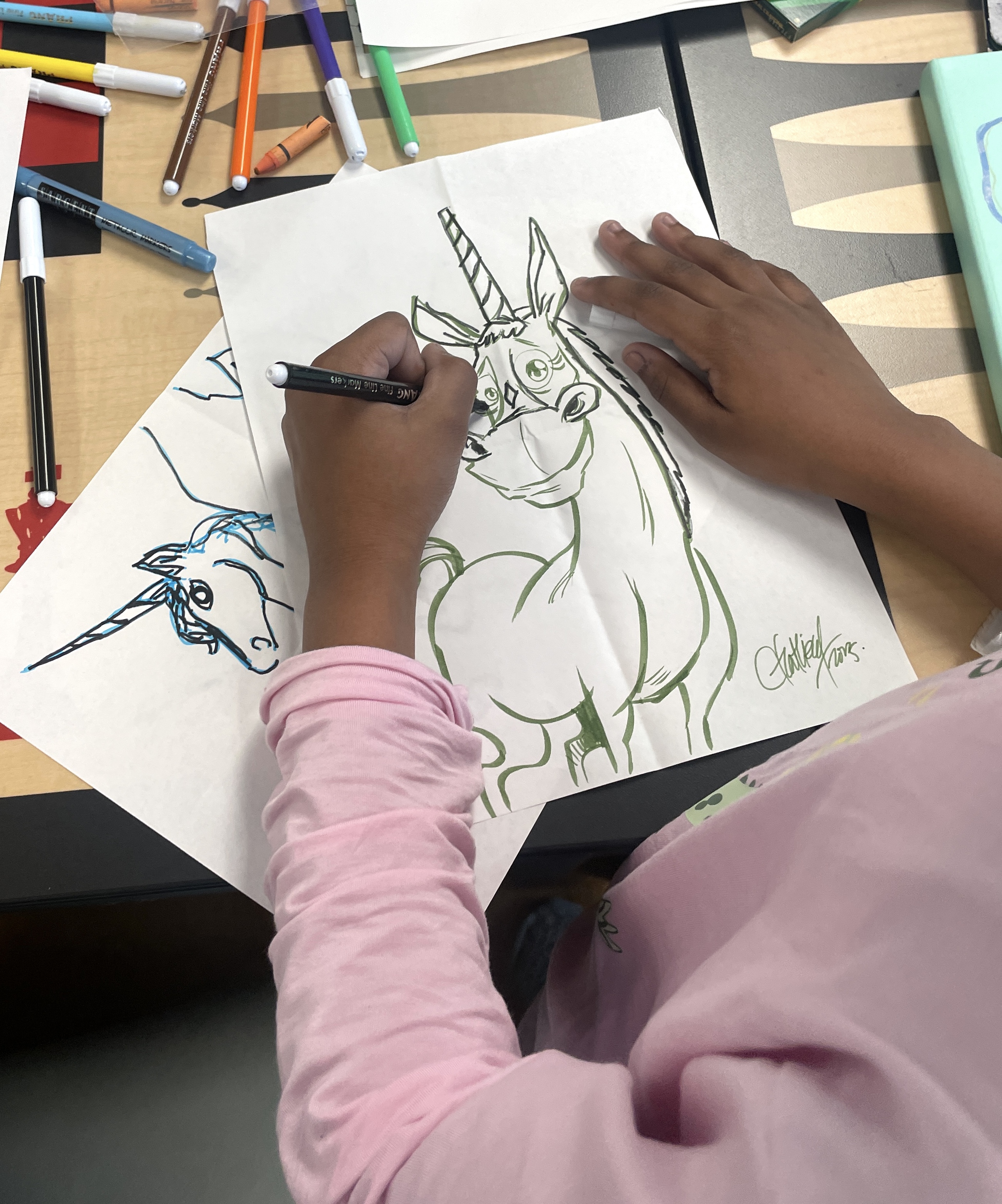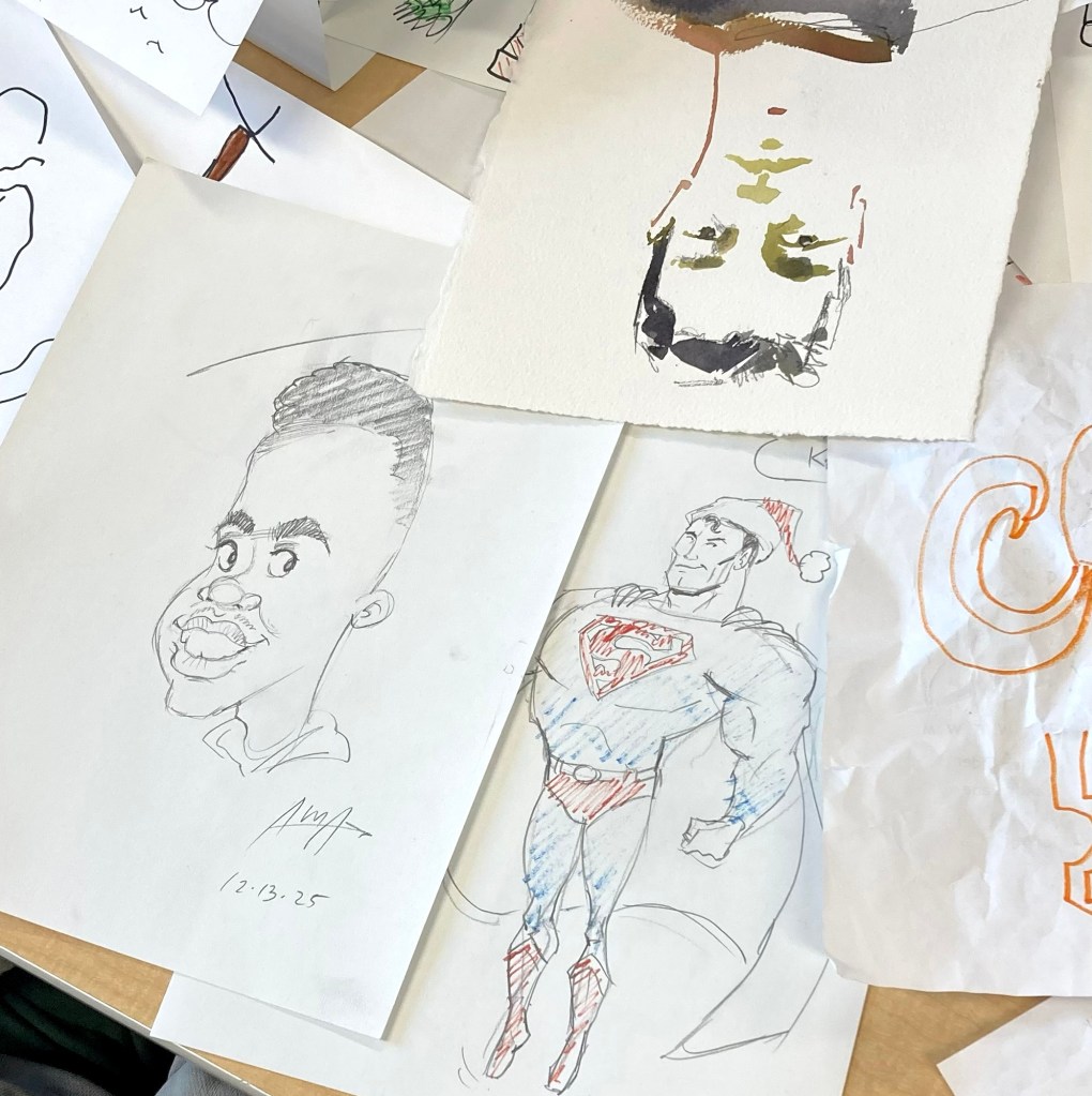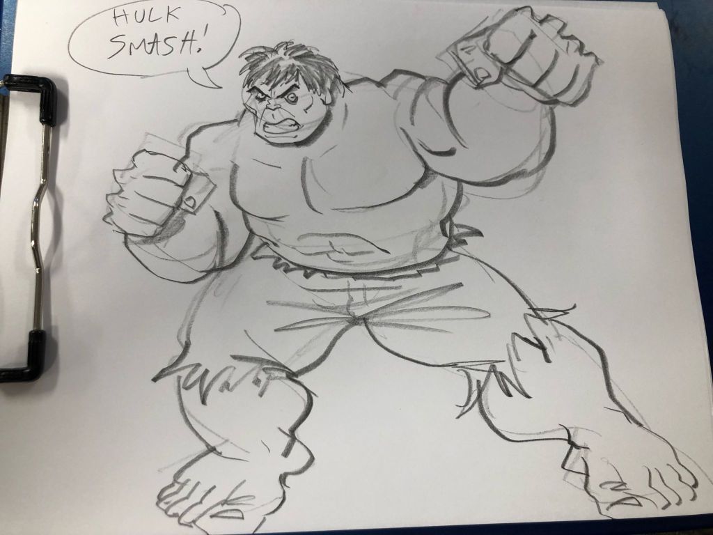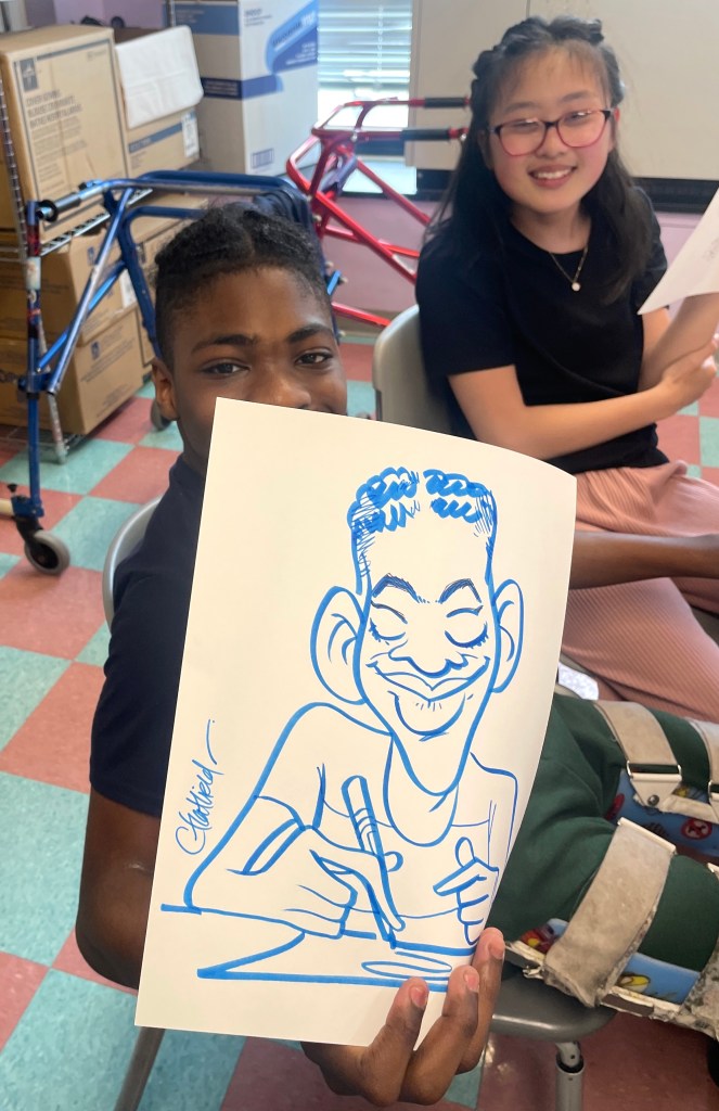 Another great day, drawing with the kids at St. Mary’s Healthcare System for Children. We made caricatures, bat businessmen, basketball stars, and mermaids galore. For a very special treat, we got to see a fantastic animatic made by a young artist we hope to see in our animation studios someday!