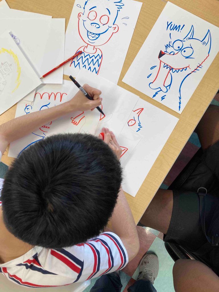 The brilliant kids at New Alternatives took the comic templates we shared and filled them with characters classic and new. We taught a little about onomatopoeia, action lines, foreshortening, and POW! these creative kids were off on their own comic adventures.