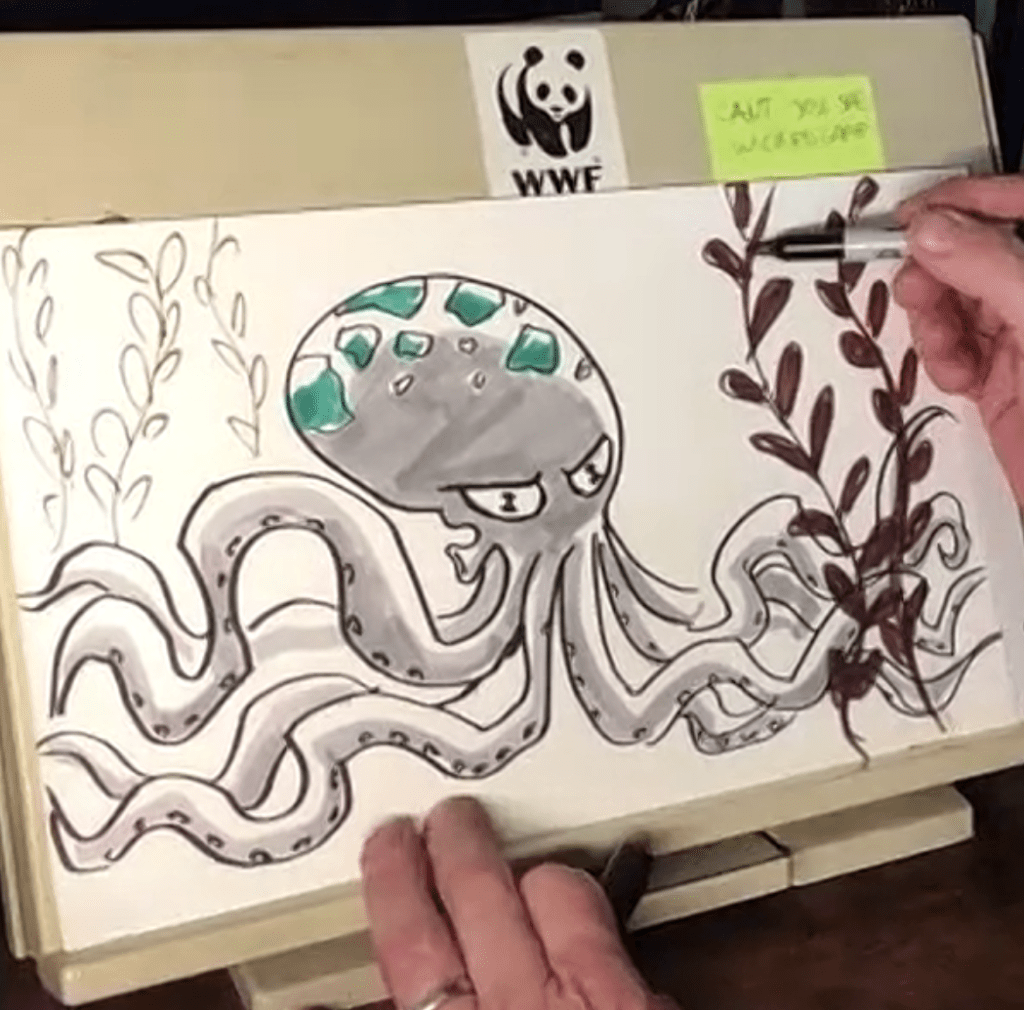 This skilled group of young artists already had a strong handle on advanced techniques like lines of action, squash and stretch, perspective, shading, and more. So we put their talents to the test on drawings of sea turtles, red pandas, axolotls, orangutans, condors, and sea, land, and air habitats. It was fascinating to talk about these animals’ adaptive techniques like camoflauge and abilities to climb, dive, or fly to places out of reach in order to help them survive. But we humans can do so much too to help reduce pollution and pressure on our fellow creatures.