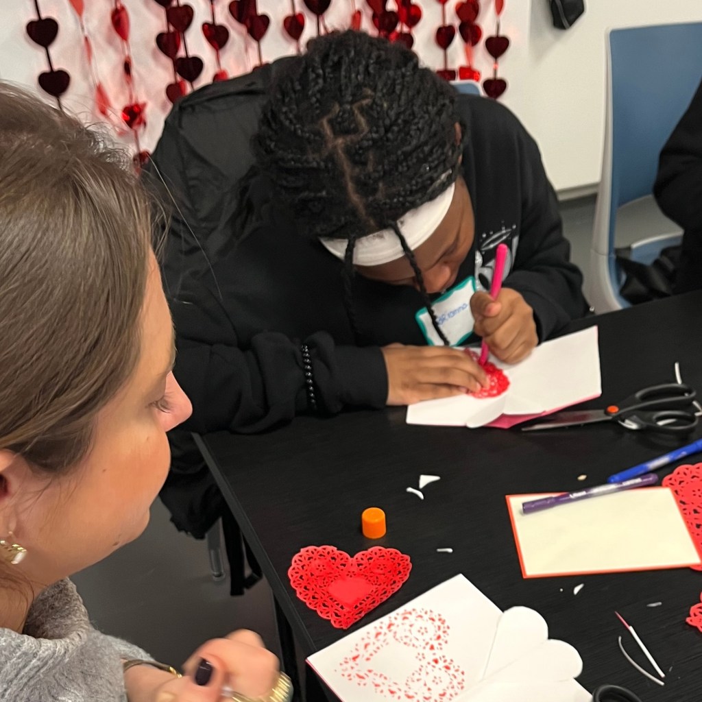 We love sharing the love of Valentine’s Day with the New Alternatives kids! At this event, we showed how to make pop-up cards and decorate gift boxes with some super fun glitter pens and heart-shaped boxes from Blick Art Materials.