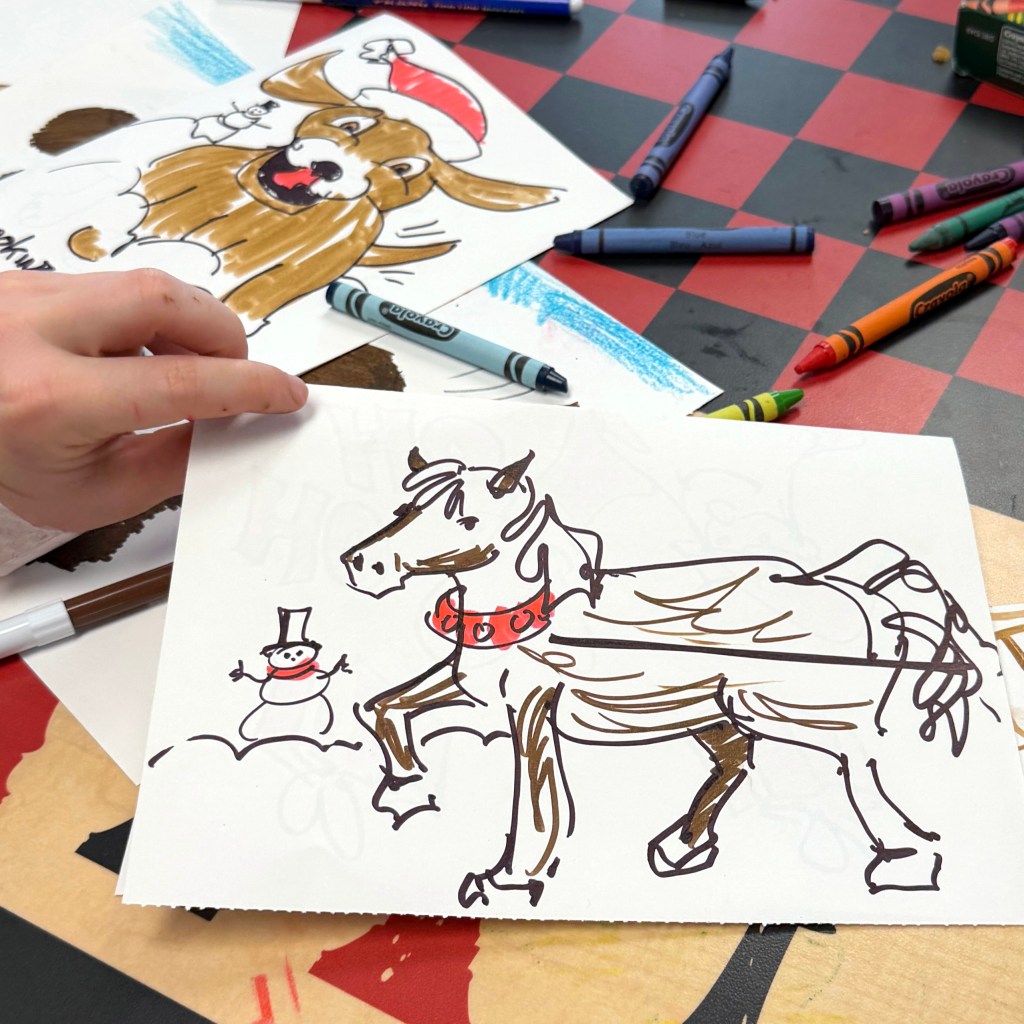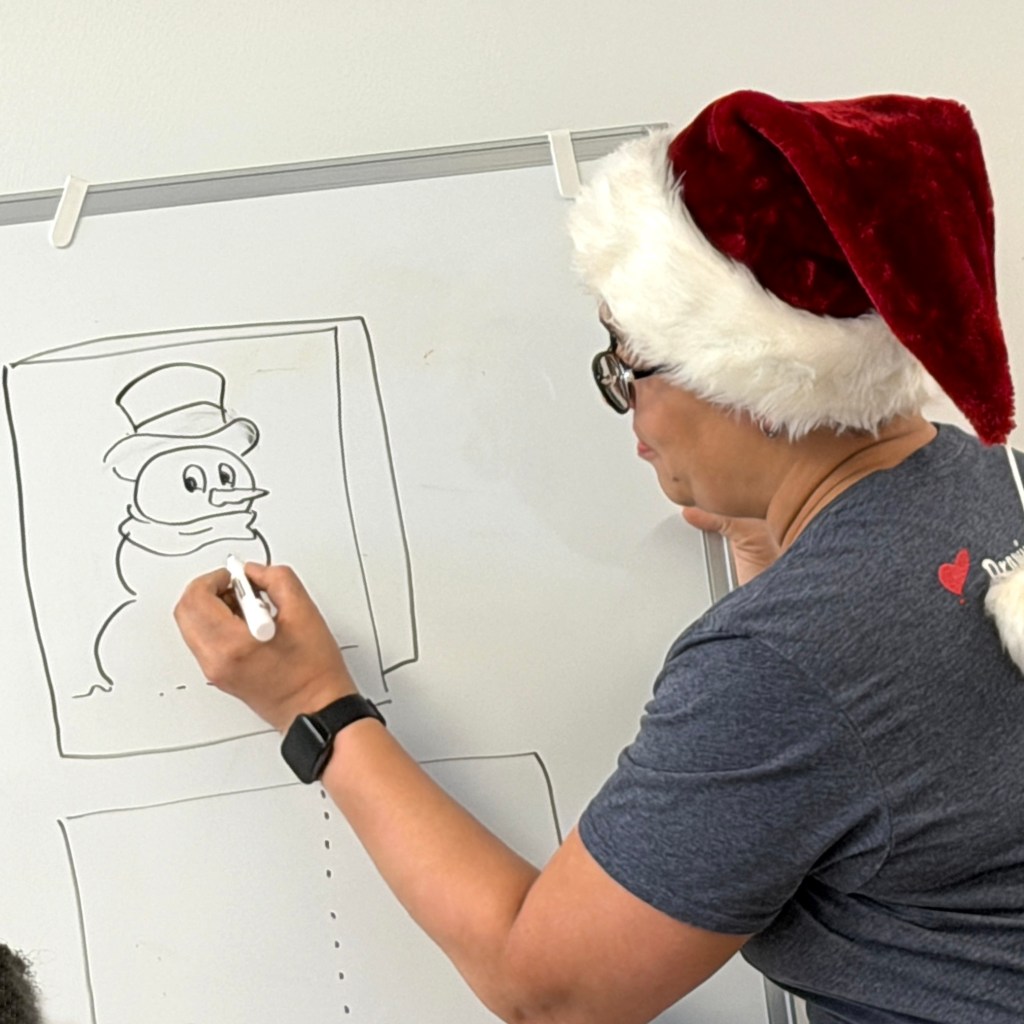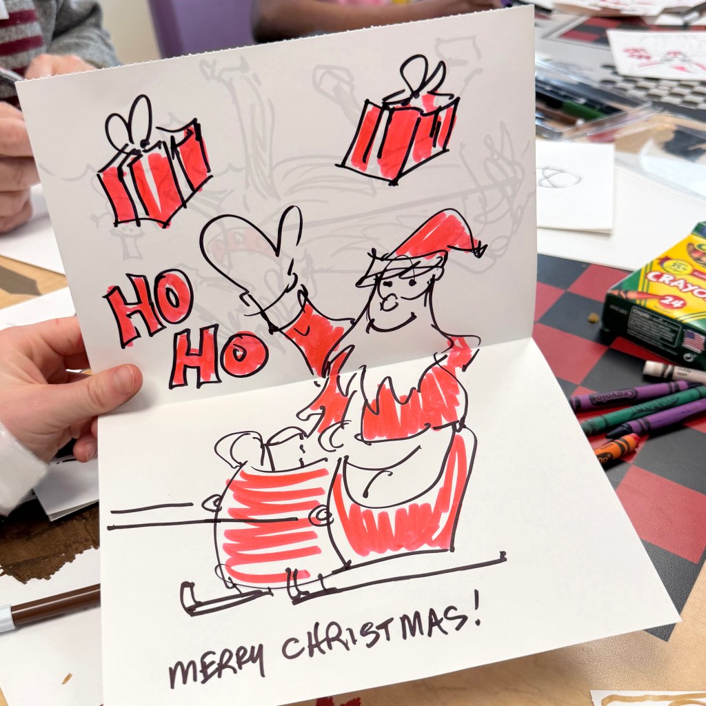 We love the great big group of kids at St. Mary’s Hospital and had so much fun helping them create special holiday cards for their family and friends. The kids donned their paper with Santas and reindeer and tall trees aglow with sparkling lights. Some lucky ones also got their caricatures done to share or keep as a special gift all their own.